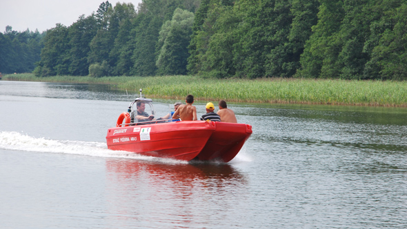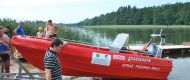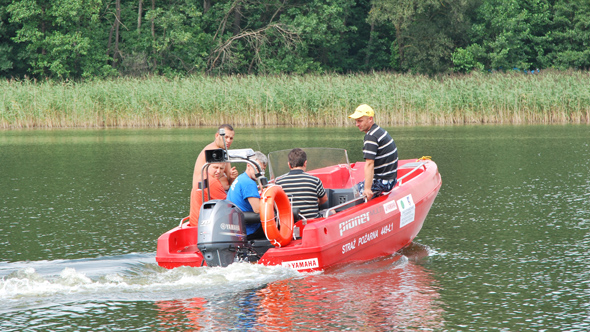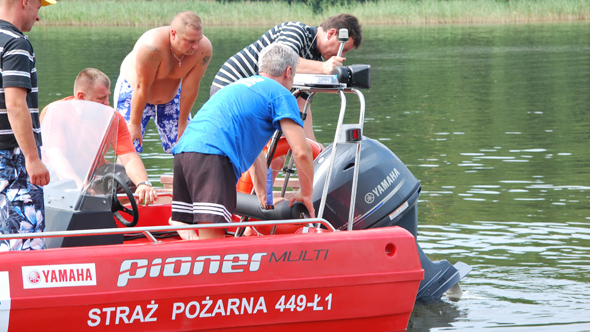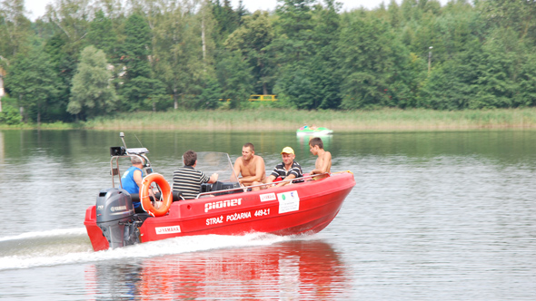 Upalna pogoda motywowała do testów na wodzie i szkoleń praktycznych przeprowadzonych przez Krzysztofa Dymowskiego z firmy Moto Kom. Pokazy zwrotności i przyspieszenia łodzi napędzanej jednym znajlżejszych silników w swojej klasie skupiły na brzegu liczną publiczność. Łódź pozytywnie przeszłatesty i teraz na co dzień będzie służyć OSP w celach ratowania ludzkiego życia i zdrowia.